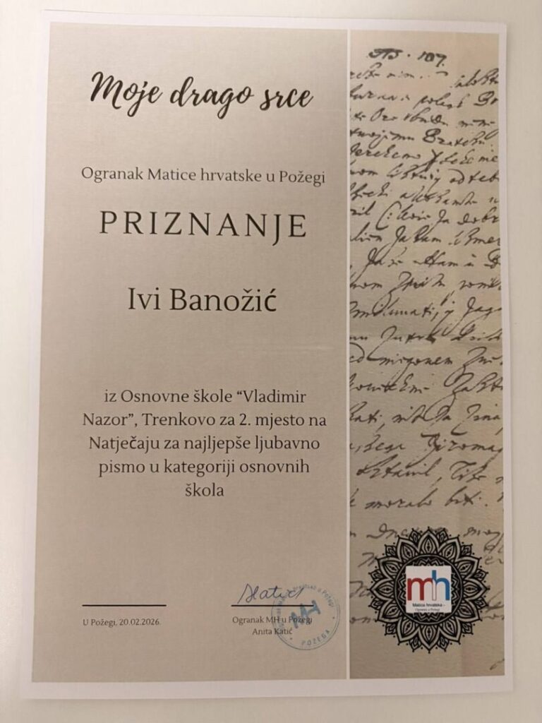 Naša učenica 8.r. Iva Banožić osvojila je 2. mjesto na Natječaju za najljepše ljubavno pismo Ogranka Matice hrvatske u Požegi u kategoriji osnovnih škola. Natječaj je nazvan “Moje drago srce,” a Svečana dodjela bila je u petak 20. veljače 2026.g. u Knjižnici Katoličke knjižnice u Požegi.